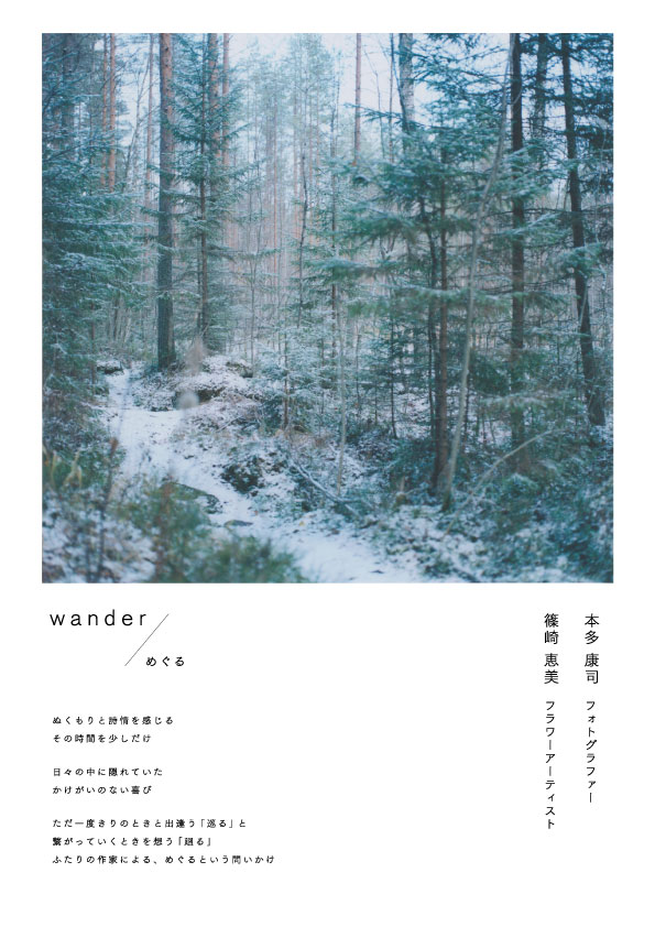 コマーシャルフォトグラファーとして広告や雑誌、書籍を中心に活動する一方で、写真集「madori」などの作品制作を行う写真家の本多康司氏と、店内装飾からウィンドウ、雑誌、広告、CM、ミュージックビデオ、商品パッケージなど、花にまつわる様々な創作を手掛ける「eden works」 主宰のフラワーアーティスト、篠崎恵美氏による共同展。ただ一度きりのときと出逢う「巡る」と、繋がっていくときを想う「廻る」。2人の作家が、“めぐる”をテーマに共振し、北欧の暮らしの身近にある自然から着想した作品を表現する。